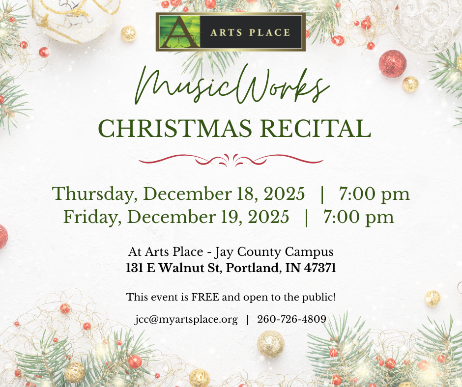 MusicWorks is a comprehensive program of music instruction for all ages currently offered at Arts Place Jay County Campus and Arts Place Blackford County Arts Center. Students learn reading music, proper playing techniques, and the fundamentals of music theory.