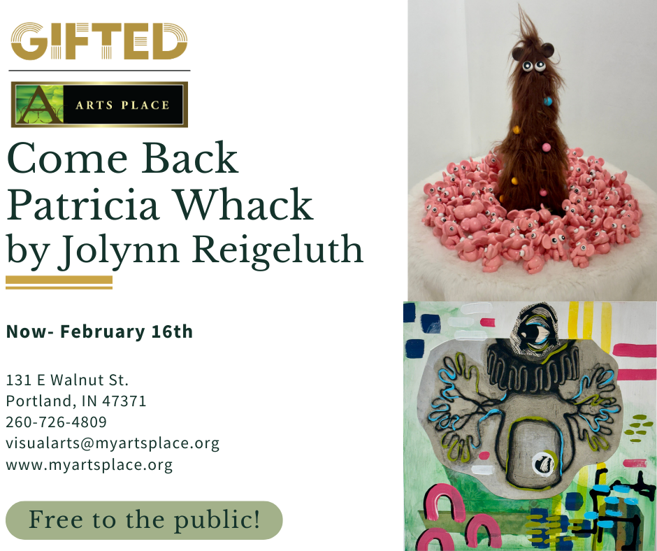 Come Back Patricia Whack by Jolynn Reigeluth + Add to Google Calendar + iCal / Outlook export Date Dec 23 2025 - Feb 16 2026 Ongoing... Location Arts Place Jay County Campus Category Weaver Community Gallery Exhibit Share this event
