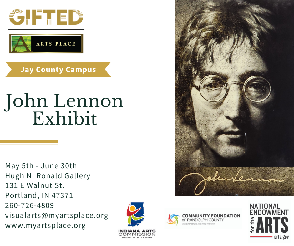 John Lennon Exhibit + Add to Google Calendar + iCal / Outlook export Date May 05 2025 - Jun 30 2025 Expired! Location Arts Place Jay County Campus Category Hugh N. Ronald Gallery Exhibit Share this event