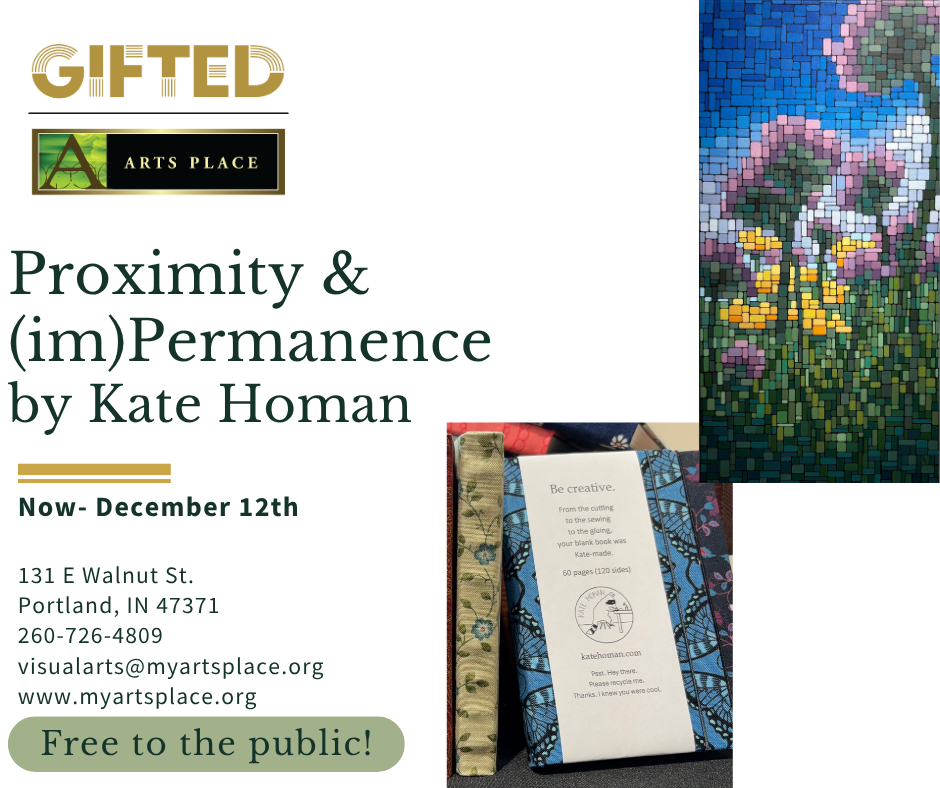 Originally from Portland, Kate Homan (Streitelmeier) now resides in Indianapolis. She is a self-taught visual artist with a passion for recycling, repurposing, and upcycling. Come support her at this free exhibit available at Arts Place Jay County Campus.